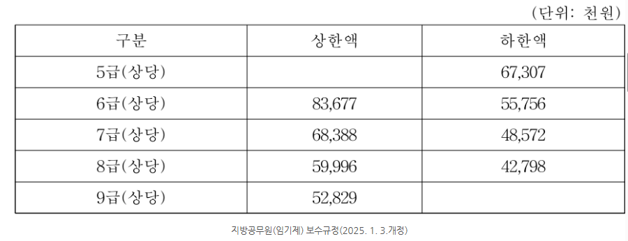 위에 보시는 기준은 2025년 1월에 개정된 공무원 보수규정 입니다. 가급(5급 상당), 나급(6급 상당), 다급(7급 상당), 라급(8급 상당) 마급(9급 상당)입니다. 그리고 9급(마급상당)의 하한액은 9급 1호봉기준으로 판단하시면 됩니다. 임기제 공무원은 기준 급여 외에도 지급보조비, 시간 외 근무 수당, 연가보상비 등의 제수당을 받을 수 있습니다.