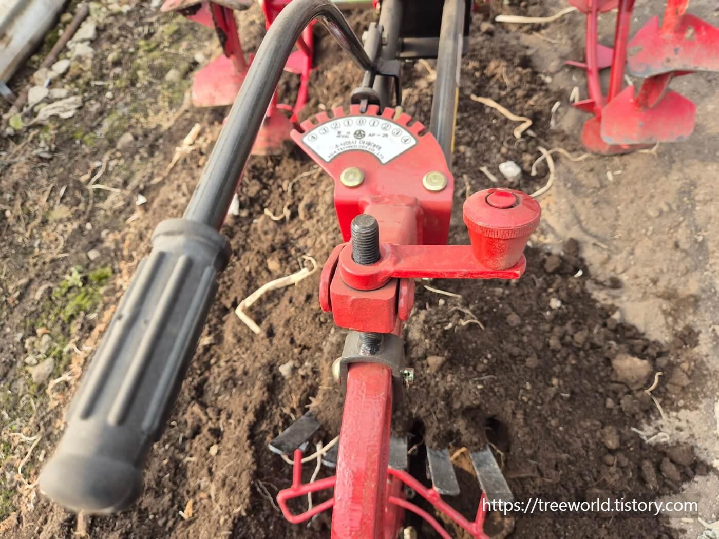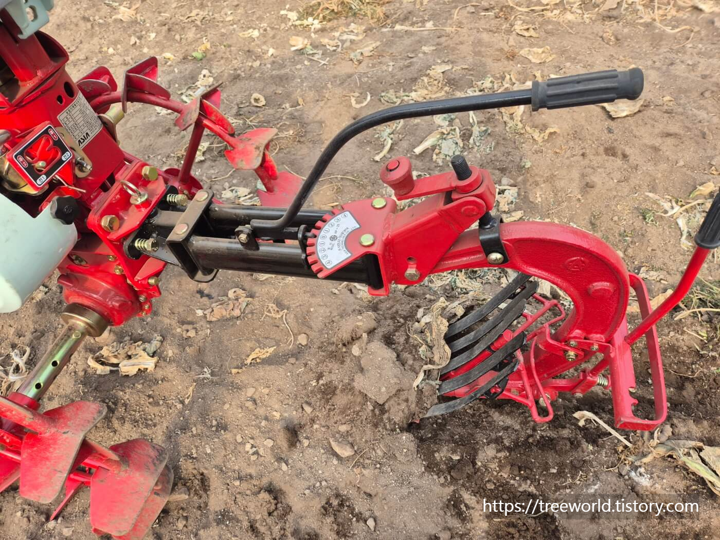 그리고 설치된 쟁기는 골타는 방향조절과 깊이를 조절하는 방향 손잡이가 있습니다. 이것으로 조절하는데 깊이는 작업하다 깊다고 생각되면 잠시 정지하고 손잡이를 돌려가며 조절해야 됩니다. 밭의 고랑이는 깊게 갈면 좋습니다. 공극을 많이 만들고 깊게 갈아엎으면 잡초가 현저히 줄어듭니다.