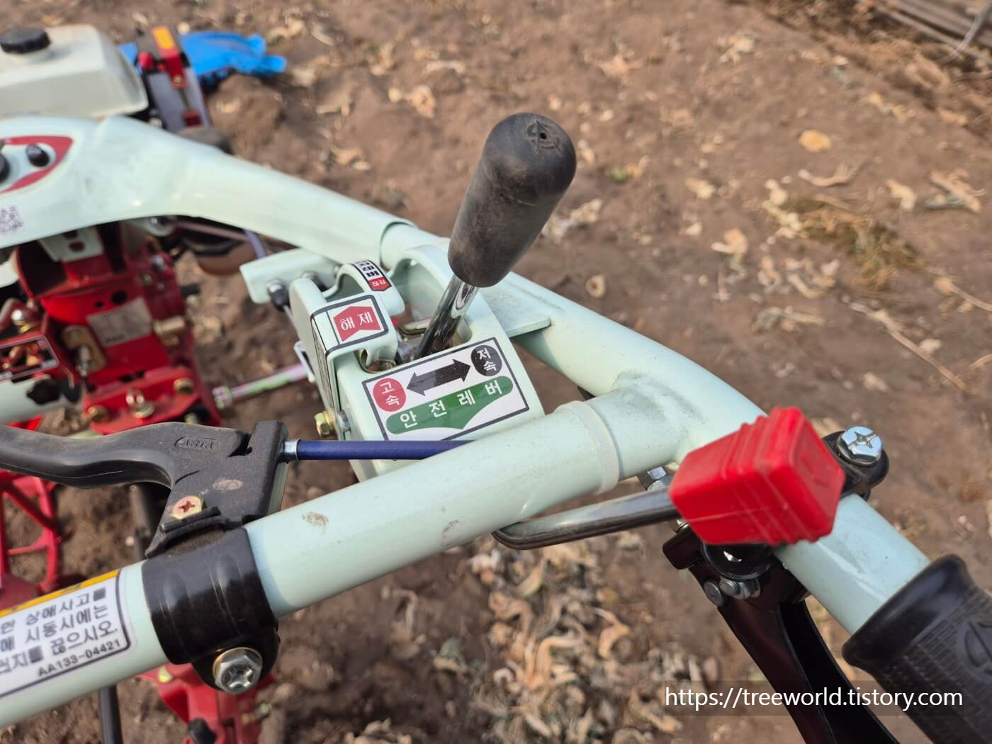 관리기를 한쪽손잡이를 잡으면 동력전달이 끊어지므로 제자리에서 360 º 회전이 됩니다. 그리고 급하게 동력을 끊으려면 오른쪽 손잡이 바로 위에 있는 붉은색 손잡이를 화살표방향인 아래도 당기면 즉시 동력전달이 스톱됩니다. 회전할 때 공간이 부족하면 사고의 위험이 있으므로 응급조치도 잘해야 합니다.