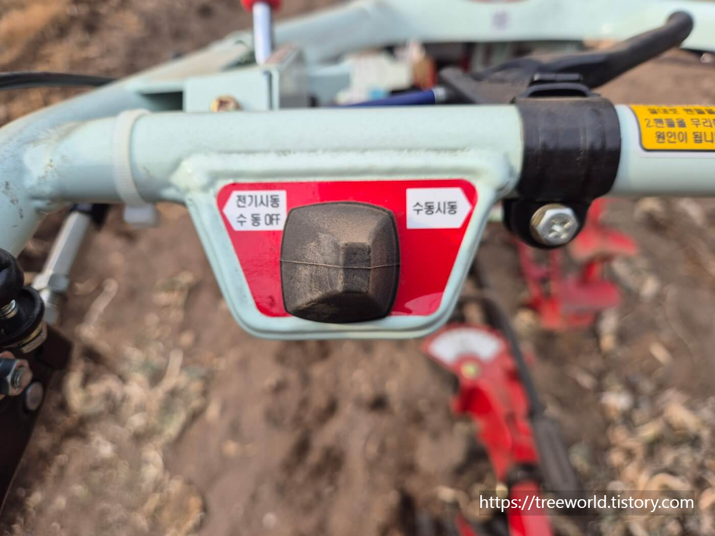 관리기 사용법 중 쟁기로 밭을 가는 방법입니다. 관리기 시동은 두 가 방법이 있습니다. 전기시동과 수동이 있는데 겨울에는 시동용 배터리의 액을 제거해야 하므로 저는 수동으로 사용을 많이 합니다.