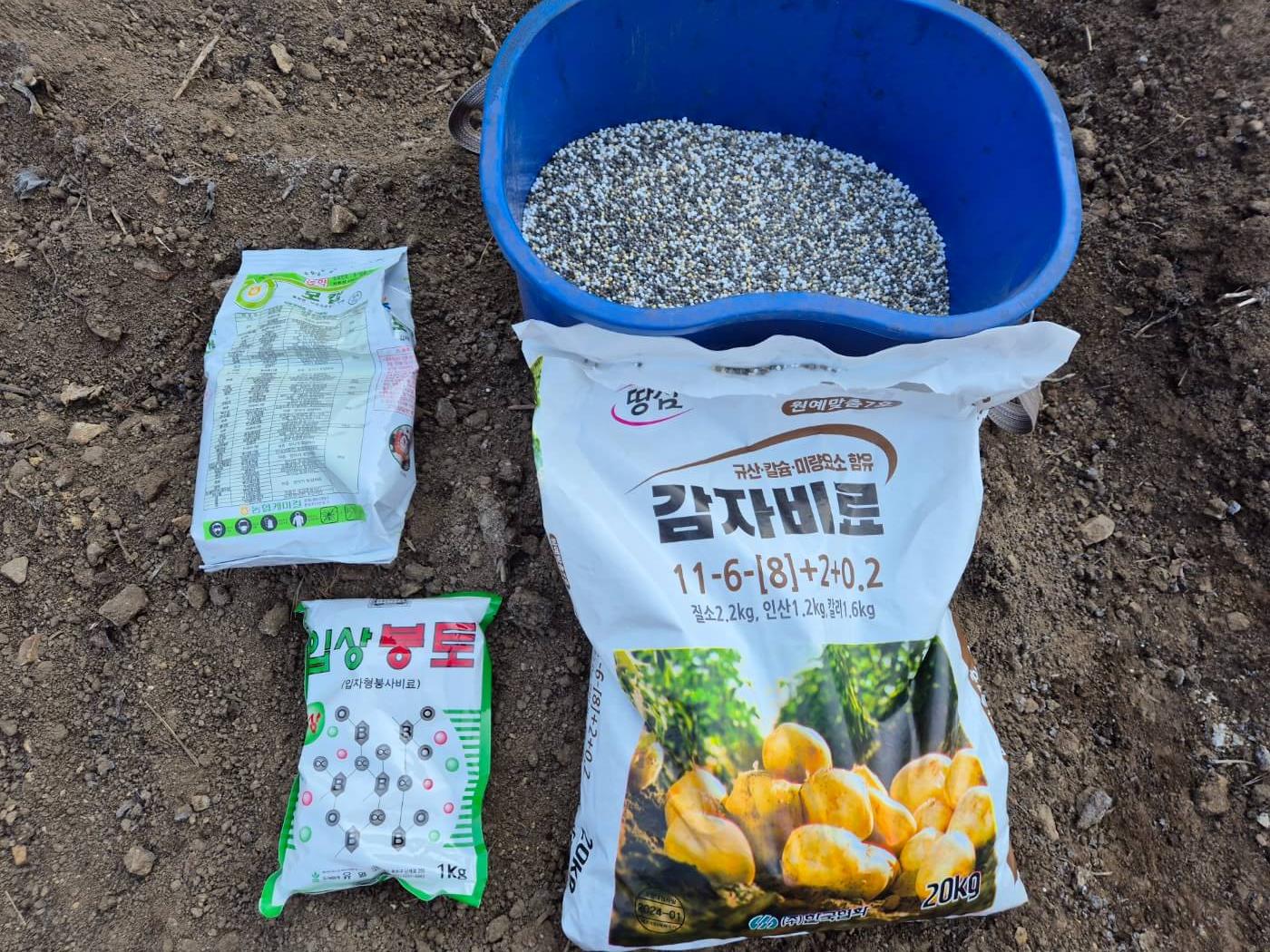 토양살충제는 감자를 파먹는 땅속 해충을 방제하고 붕소는 감자의 분을 많게 하고 부드럽게 만들어 줍니다. 밑거름과 토양살충제를 시비하고 1주일 정도 있다가 씨감자를 심는 것이 좋습니다.