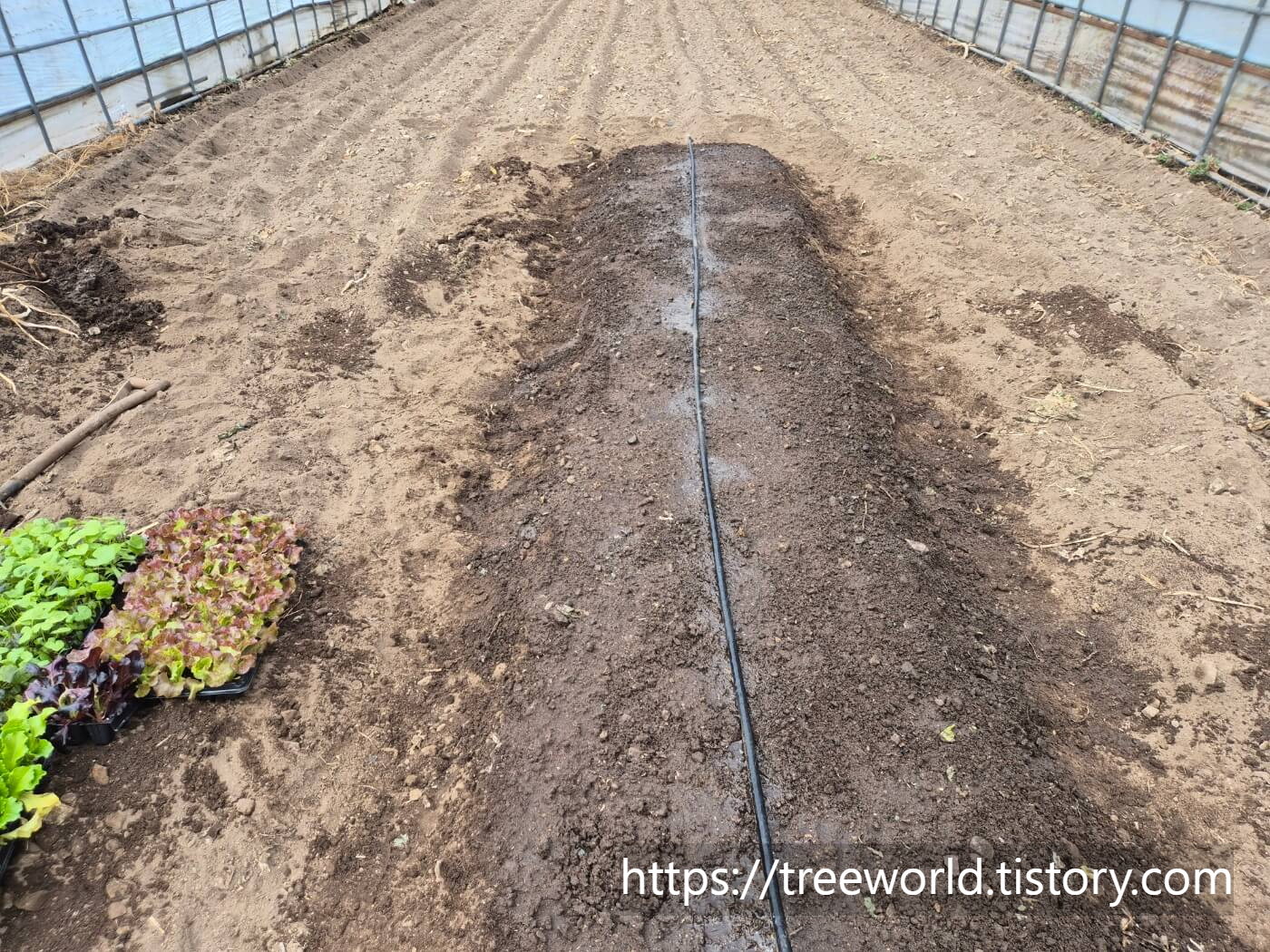 모종을 심기전에 충분한 관수를 하고 모종에도 물을 주고 심어야 하며 점적관수를 위한 점적호스를 설치해 주면 물이 표면수로 흘러가지 않고 조금씩 땅속으로 스며들어 한번 관수로 1주일은 수분유지가 가능합니다.
