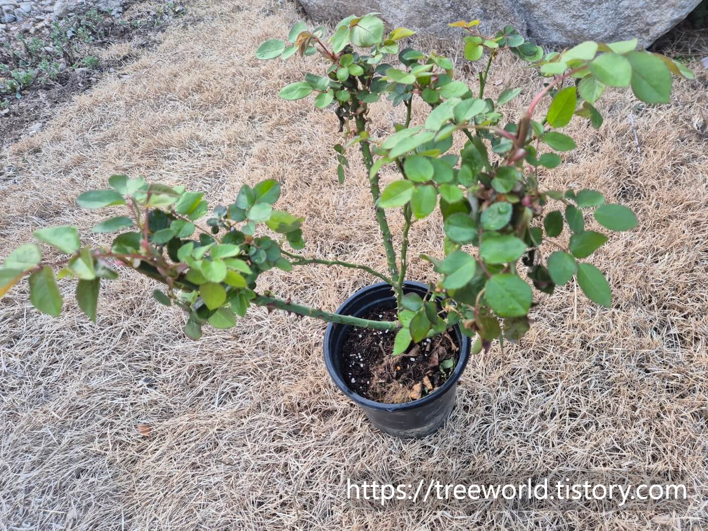 사계장미 2~3년생 묘목은 가지가 여러개 나있습니다. 가지마다 새로운 가지가 나서 꽃이 핍니다. 그러므로 심기 전에 최대한 전정을 해서 새 가지가 나오게 하여야 합니다.