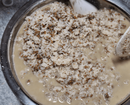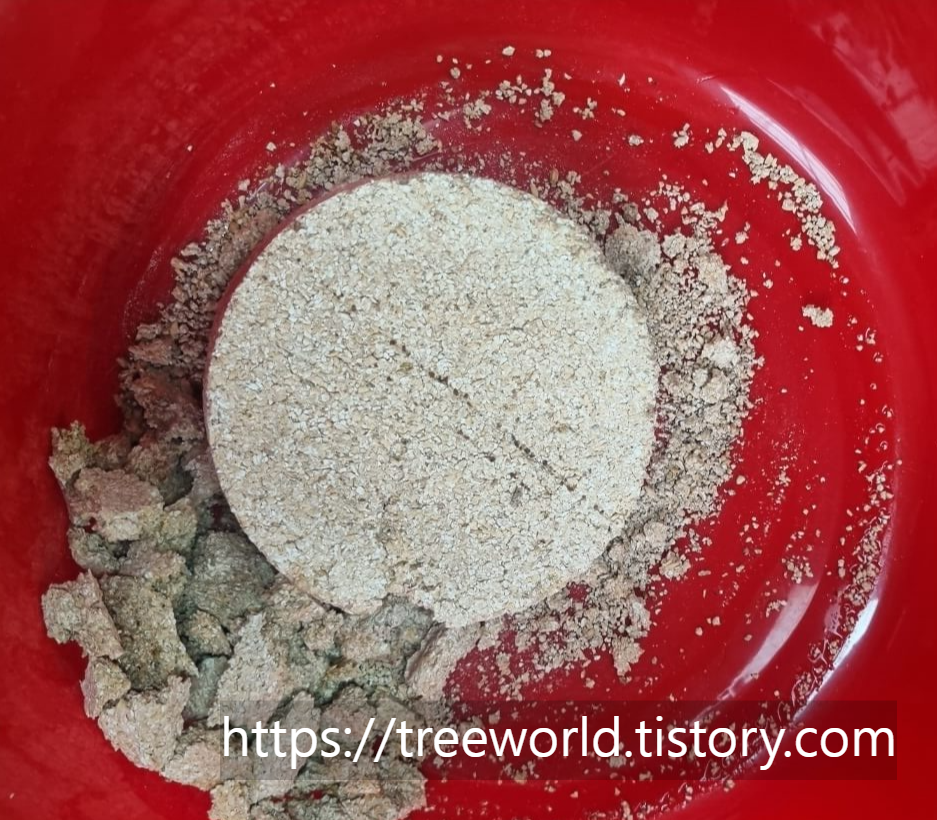 고두밥이 완성되면 누룩을 밥량의 25~30%, 즉 500g을 물에 불려 잘 으깨주는데 물량은 누룩의 2배인 1L가 적당합니다.