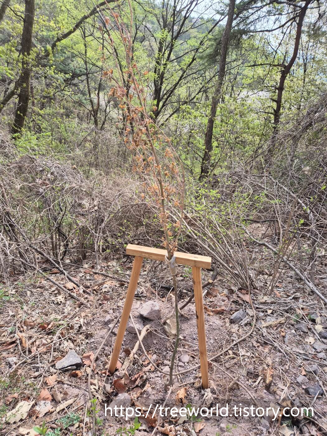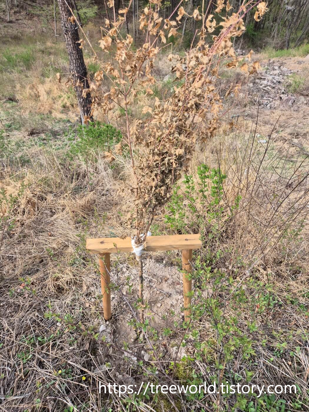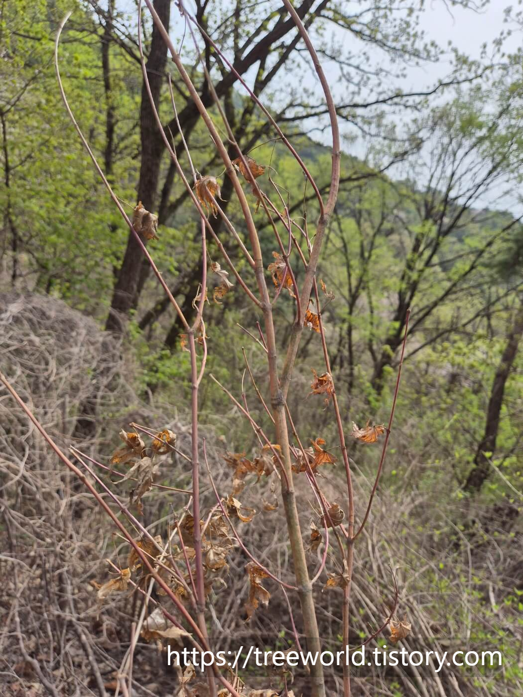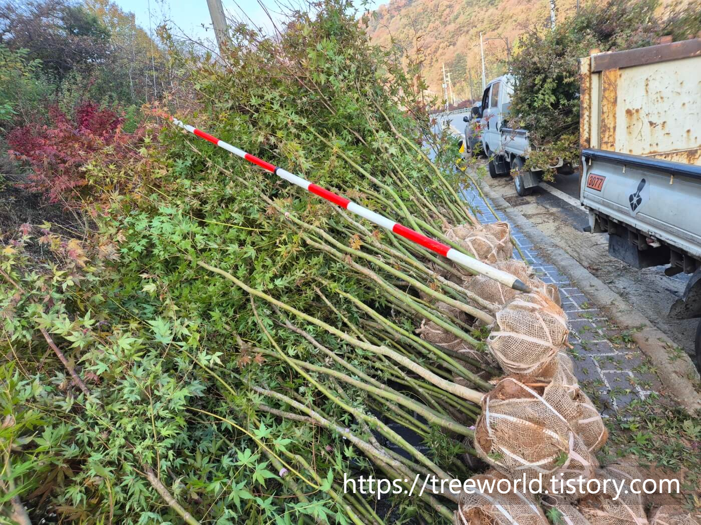2024년 가을 임도변에 식재한 청단풍나무는 잘 자라고 있습니다. 수고가 1.5m정도 된 것으로 근원경은 2~3cm 정도였으니 3~4년 이상 자란 나무들입니다.