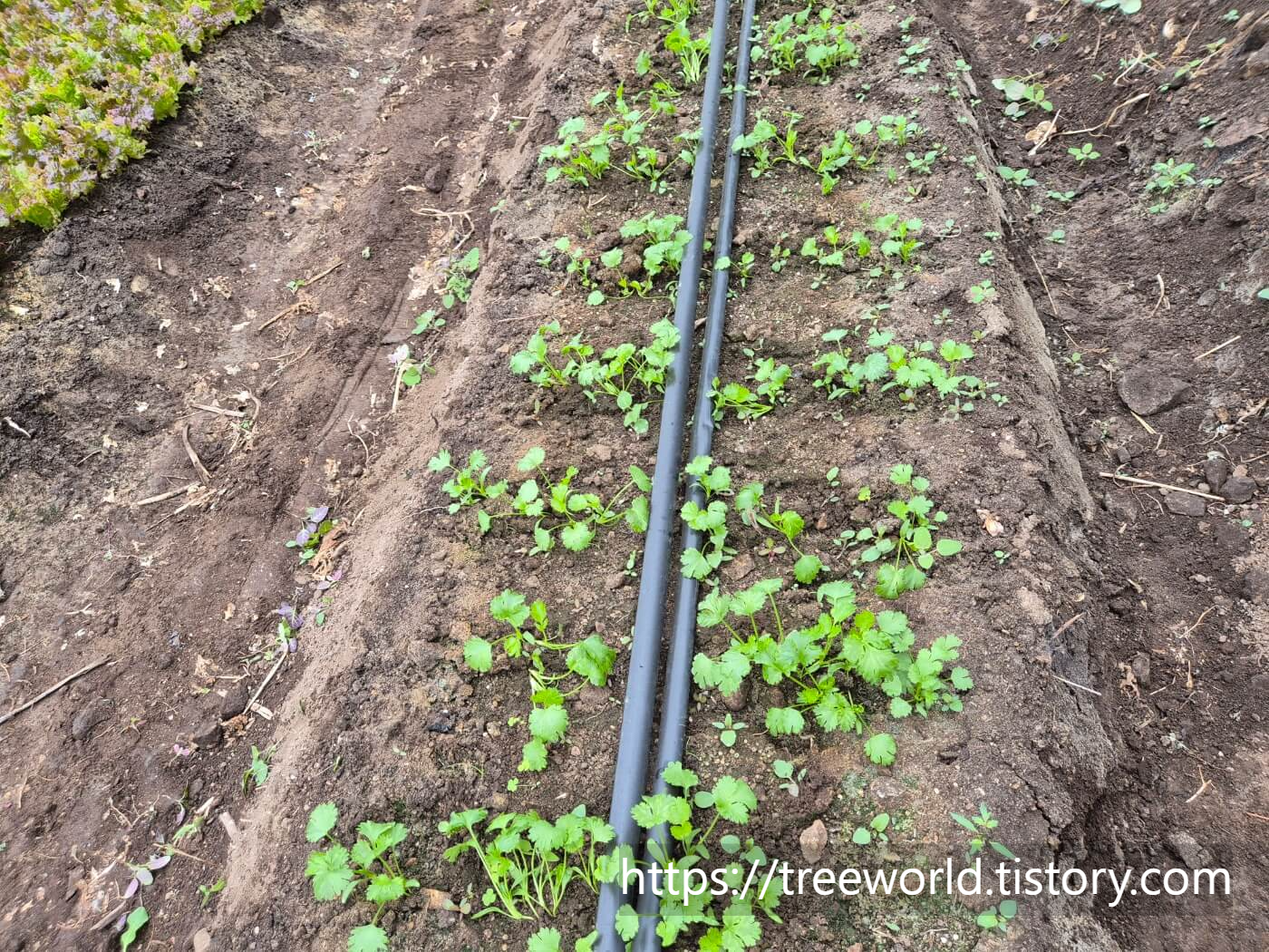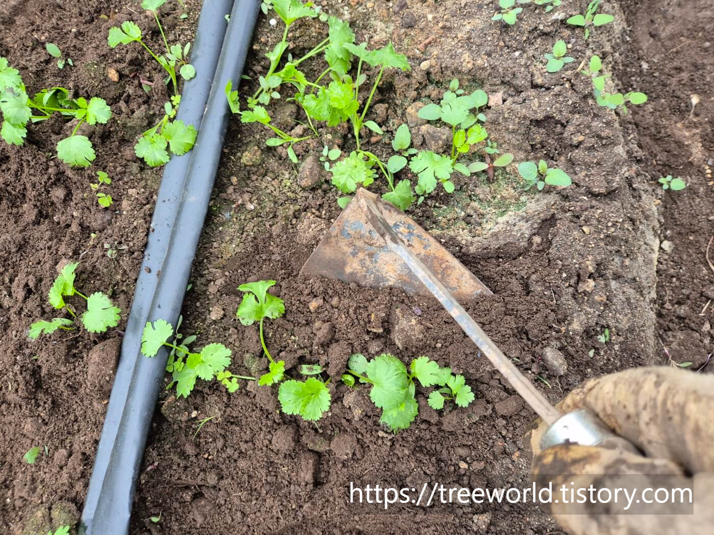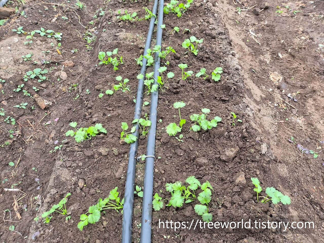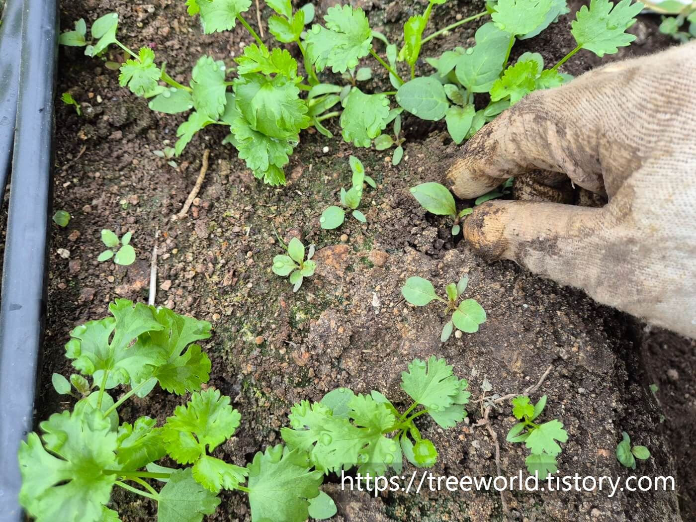 고수씨앗을 파종하고 3주 정도 되면 고수가 어느 정도 크게 되는데 이때 흙을 북돋아 주어야 합니다. 고수는 줄기에 힘이 없기 때문에 그냥 두면 쓰러져 바닥에 누워서 자라게 됩니다.