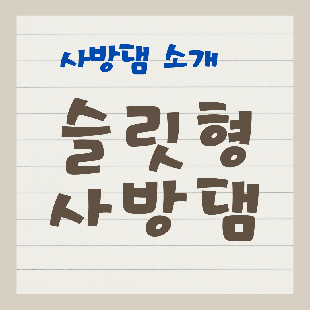 슬릿형 사방댐은 중력식 콘크리트 사방댐과 외형상의 모습은 비슷하지만 작은 유송잡물은 투과부인 슬릿을 통과하고 큰 토석류만 슬릿에 걸리거나 토석류의 이동속도를 줄여 하부의 피해를 최소하 하는 방식의 댐으로 환경을 최대한 살릴 수 있는 댐입니다.
