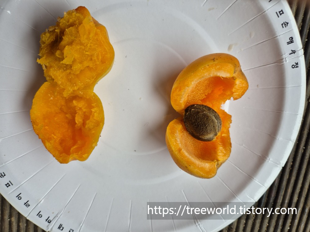 왼쪽은 쪼개면 쪼개지지 않고 그냥 강제로 찢어지는 듯한 느낌을 주는 매실이고 오른쪽은 깨끗하게 갈라지는 살구 입니다. 이것으로 명확하게 구분되고 맛은 매실은 신맛이 강하고 살구는 단맛이 강합니다.