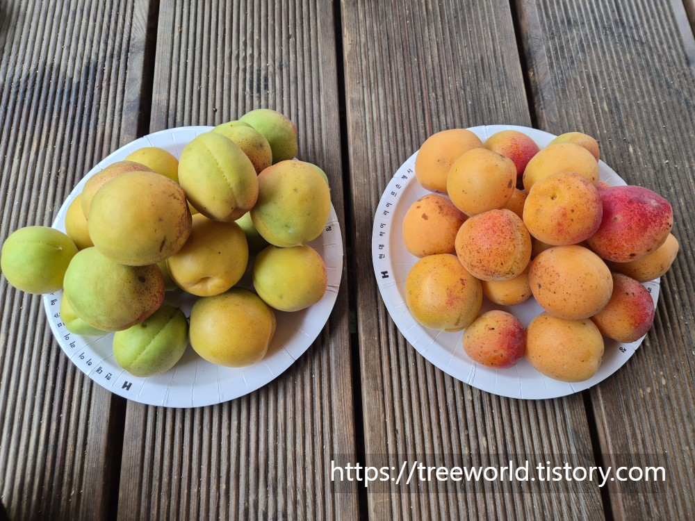 6월 말에서 7월 초에 다 익은 매실과 살구열매입니다. 매실은 청매실과 홍매실에 따라 모양의 차이는 있습니다. 청매실은 익어도 거의 푸른색이고 홍매실은 익으면 붉은색입니다. 살구는 크기에 따라 개살구와 양살구로 구분할 수 있습니다. 재래종인 개살구는 아주작고 잘 익어도 맛이 달짝지근하지 않고 살짝 쓴맛이 납니다. 그러나 양살구는 매우 달콤하고 과즙이 풍부합니다.