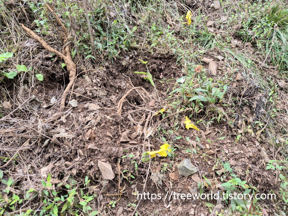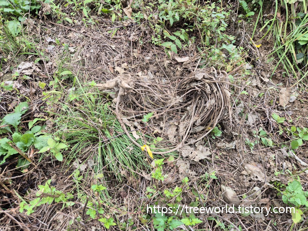 덩굴제거 작업을 뿌리굴취로 하고나면 남은 작은 칡덩굴의 줄기에 다시 분얼이 생겨 세근이 나옵니다. 그리고 이것이 다시 하나의 칡뿌리가 되고 덩굴이 됩니다.