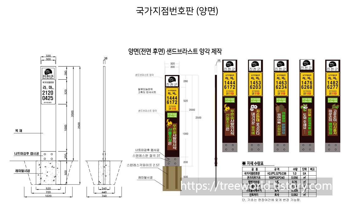 국가지점번호판을 세울때는 하단부에 스테인리스각 파이프와 스테인리스판을 너트로 붙인 다음 레미탈로 시공하여야 됩니다. 그리고 중간에 들어가는 문구는 여러 가지가 있으니 발주처와 협의 후 결정한 다음 제작하여야 합니다. 국가지점번호는 신청하면 1달 정도 후에 나오게 되니 미리 신청하여야 합니다.