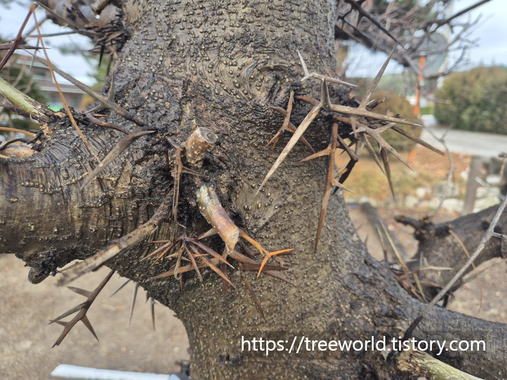 주엽나무 수피는 굵은가지는 회색이고 어린가 지는 붉은 흑색입니다. 주엽나무 목재는 붉은색을 띤 아름다운 결이 있어 목재로도 좋은 재료입니다.