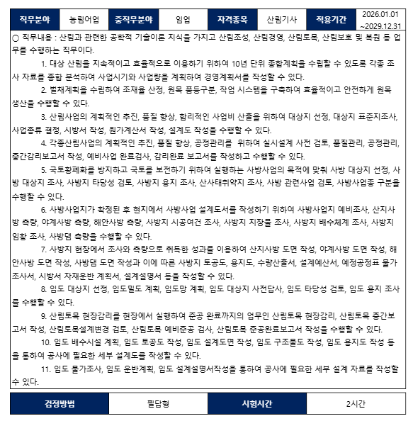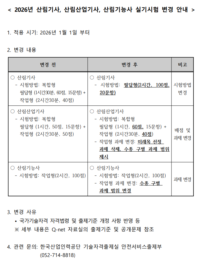 2026년 1월 1일부터 산림기사, 산림산업기사, 산림기능사 실기시험 출제과제 및 과제의 배점이 변경되고 시험방법 변경이 고시되었습니다.