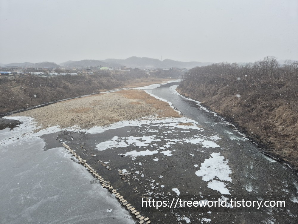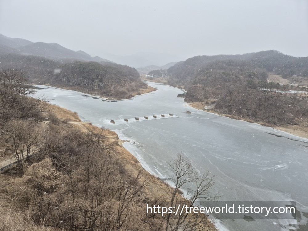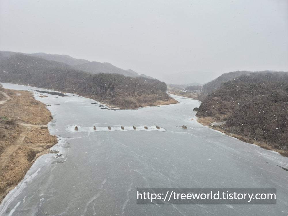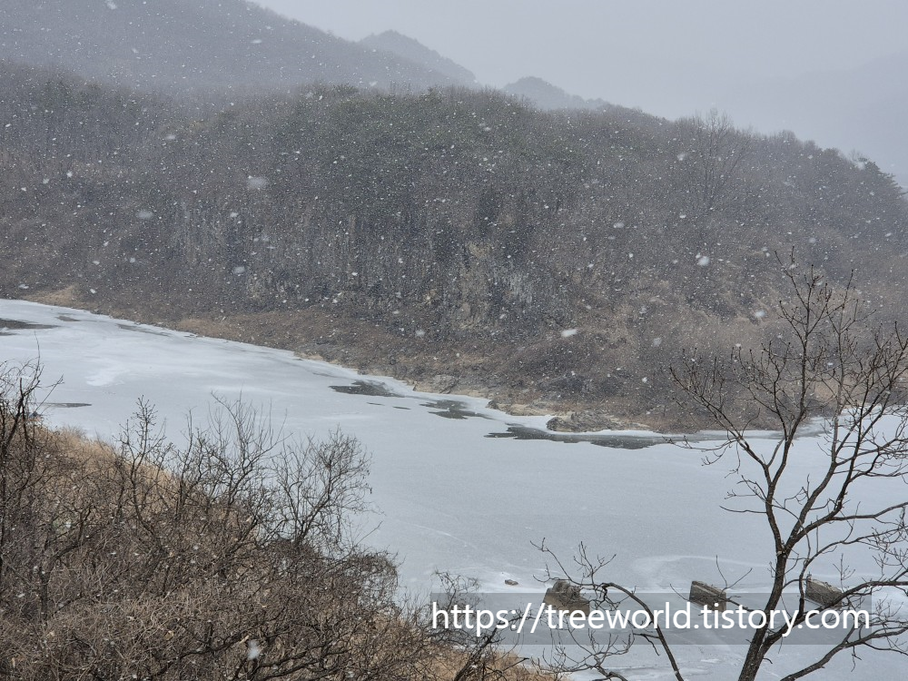 눈이 많이 와서 사진이 선명하진 않지만 두갈래 물길이 만나는 곳에 베개처럼 튀어나와있는 용암입니다. 이러한 한탄강 현무암 용암은 계곡을 따라 형성되어 있으며 한탄강 주상절리와 어우러져 절경을 만들어 냅니다.