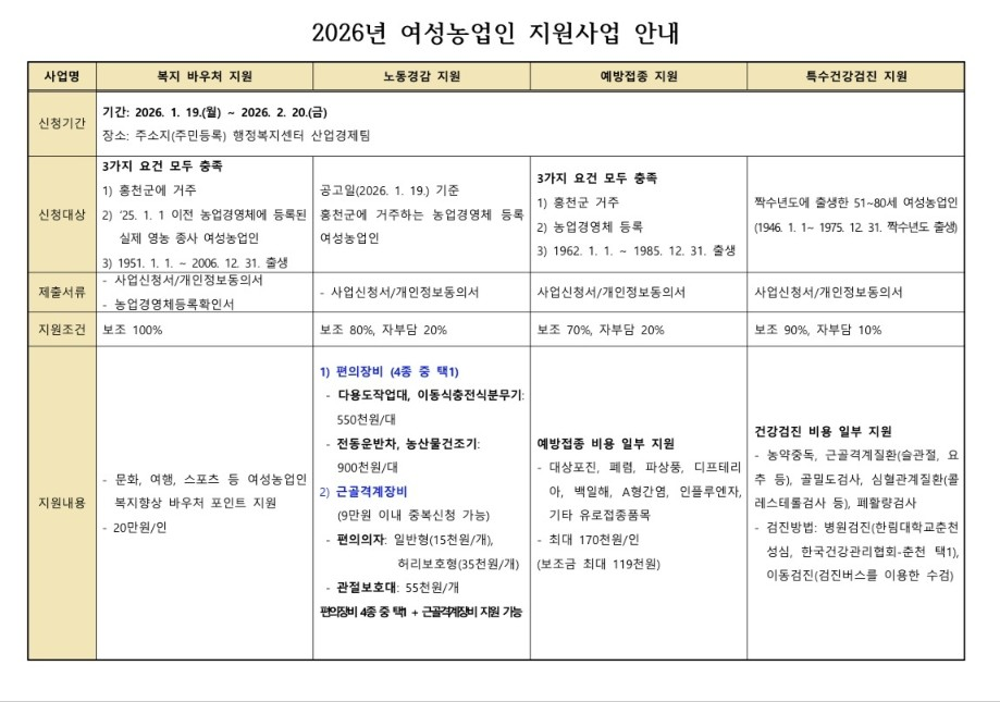 지원사업은 ① 여성농업인 행복(복지)바우처 : 문화, 여행 등에 사용되는 바우처 포인터 20만 원, ② 농작업 편의장비 지원사업 : 노동강도를 줄이는 장비와 물자 지원 자부담 20%, ③ 여성농업인 센터 운영 : 고충상담, 보육 프로그램등 ④ 예방접종, 특수검진, 출산지원 등이 있습니다. 세부내용은 지차제별로 차이가 있어 직접확인이 필요합니다.