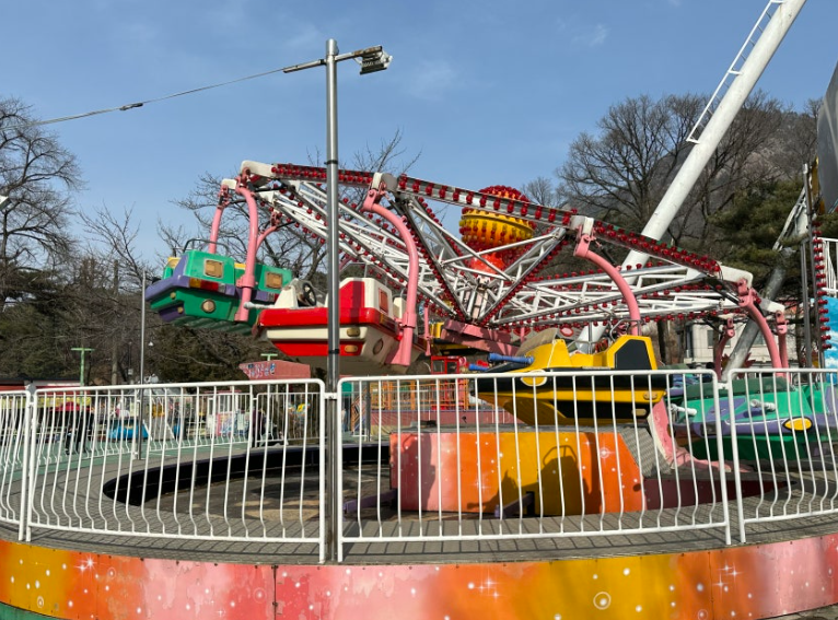 산책로가 끝날 때쯤에는 아이들 얼음 썰매장이 있어 아이와 같이 탈 수 있습니다. 부모는 자전거를 타고 아이들은 썰매 안에서 2명까지 탈 수가 있어 즐길 수 있는데 20분에 16,000월 정도였습니다. 산책을 하고 얼음 썰매를 타고 나오면 놀이기구가 여러 종류가 있습니다. 전체적으로 타려면 15,000원 정도 합니다.