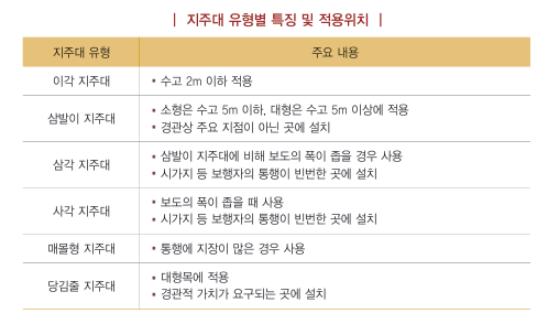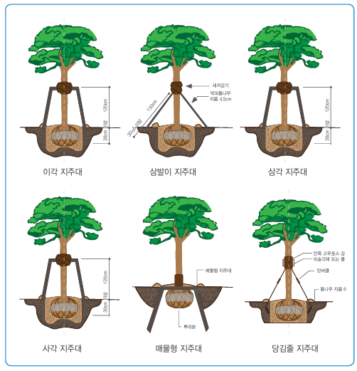 지주대의 유형에는 이각지주대, 삼발이지주대, 삼각지주대, 사각지주대, 매몰형지주대, 당김줄 등이 있으며 종류별로 시공하는 수목이 다릅니다.